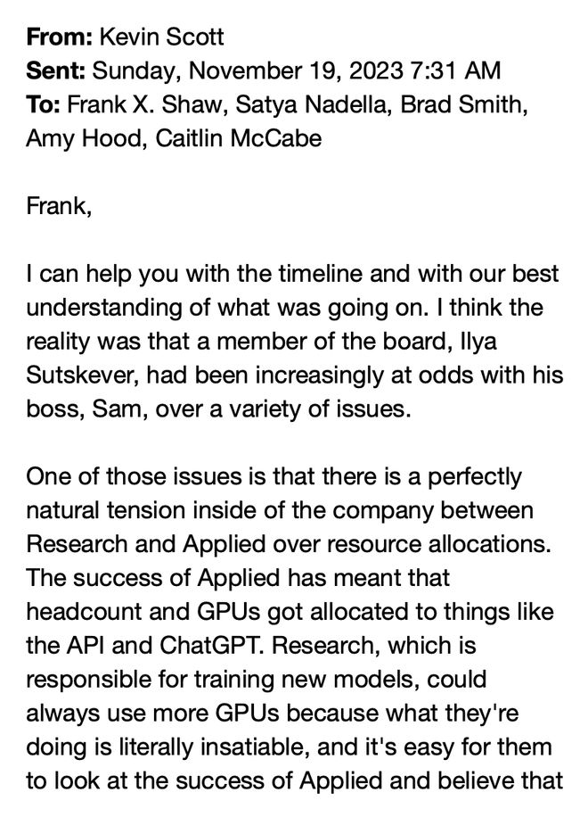 2023年11月,微软首席技术官Kevin Scott向CEO纳德拉汇报时如此剖析局势: