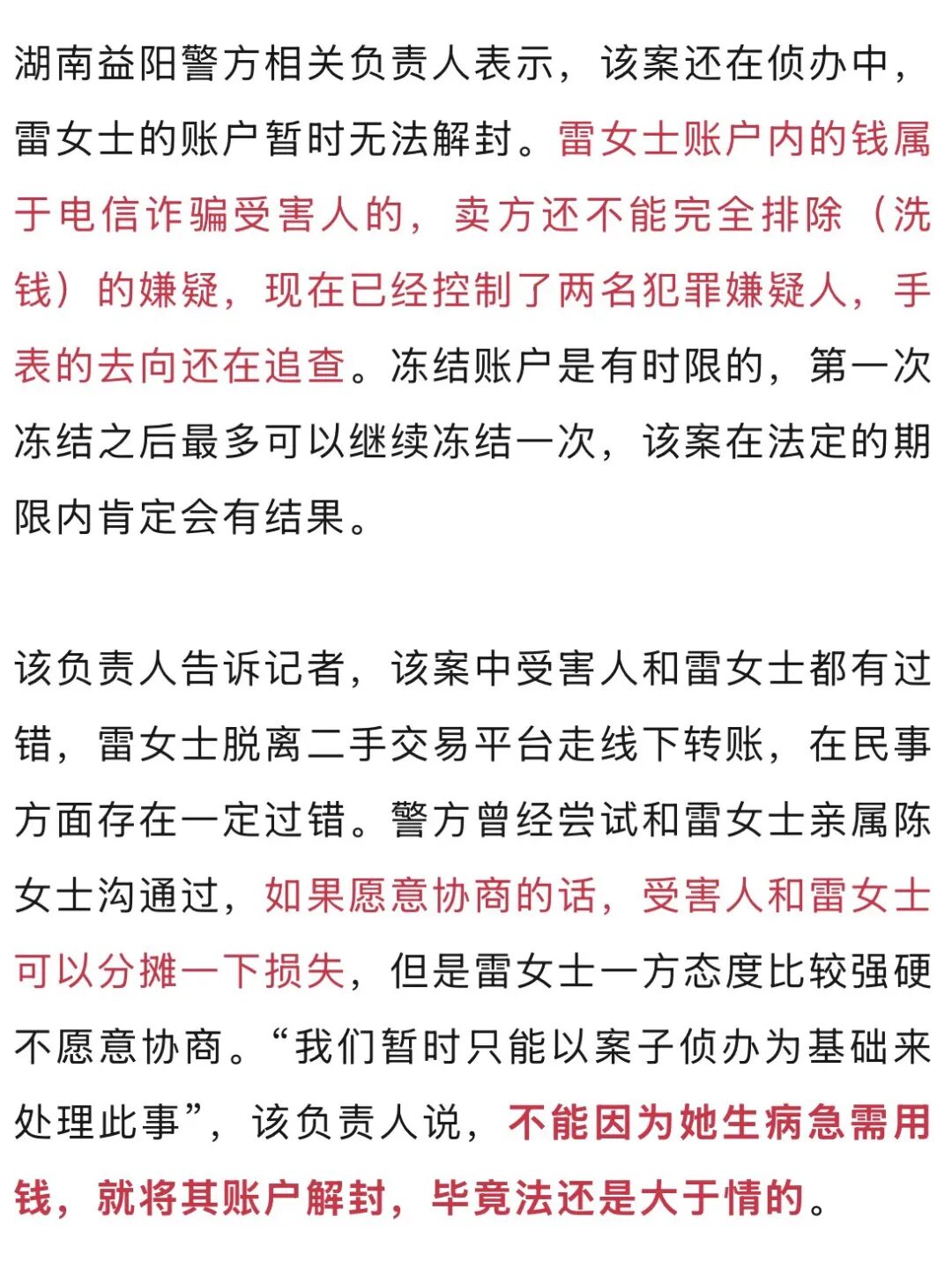 1月23日,记者从湖南省益阳市资阳区当地警方获悉,雷某某系脱离二手交易平台采用线下支付,账户内收到的十六万元,为电信诈骗案受害者的钱款,该案仍在侦办当中,账户暂时无法解封。