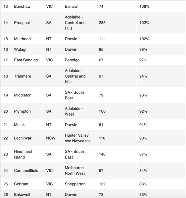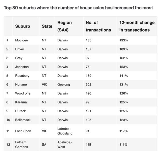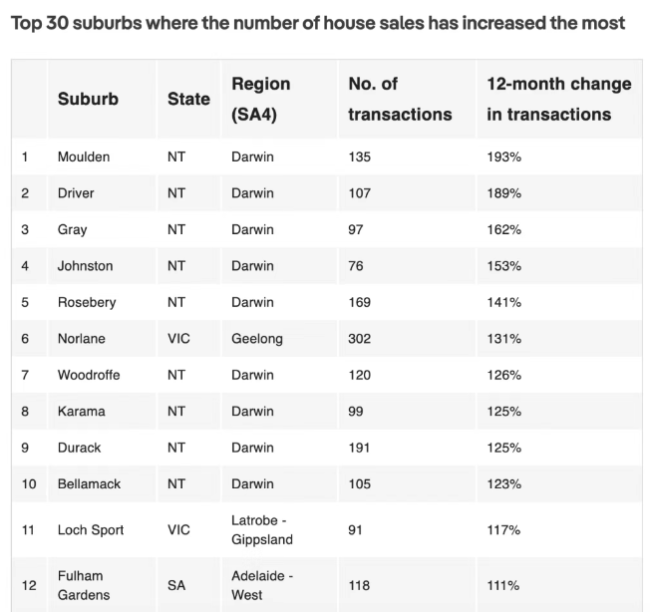 PropTrack最新数据显示,部分区过去一年的房产成交量较前12个月增长高达两倍。成交增幅最大的区域集中在实现重大复苏的房产市场,其中达尔文表现尤为突出。