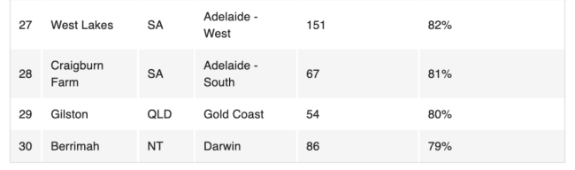 阿德莱德多个区的成交量也出现显著增长,其中Fulham Gardens(上涨111%)、Prospect(上涨102%)、Plympton(上涨92%)和West Lakes(上涨81%)表现亮眼。
