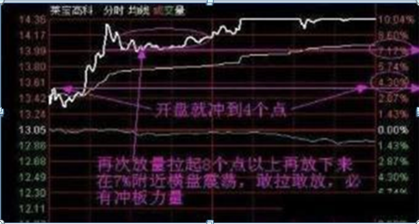为什么呢?这是因为如果低于7~8个点,说明推高愿望不强,后面未必能冲击涨停板。如果比在7~8个点一带做停顿整理就直接冲击涨停板,看起来虽然很强,但其实其中有假,不排除主力是一个诱多行为。