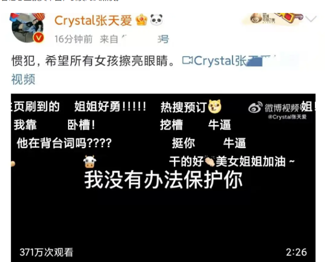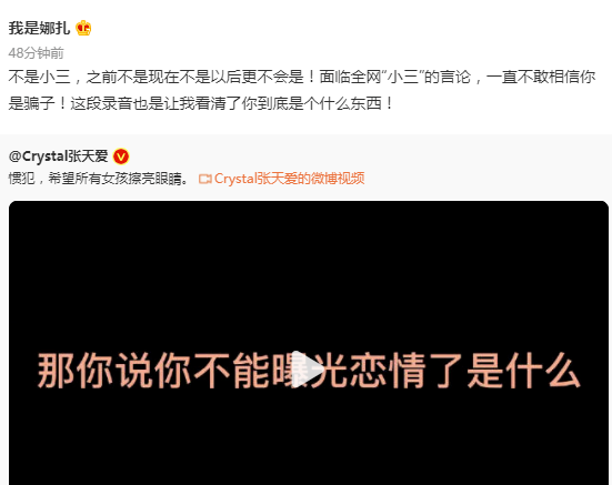 这次三角恋危机,她转发张天爱微博表示自己不是小3,也是被骗了,再次得到了观众的支持。