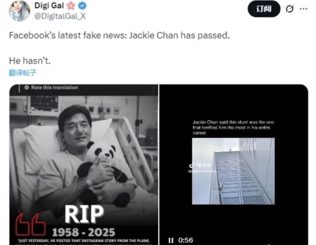 不过11月11日,成龙为自己的新电影打call,去世谣言不攻自破,成龙还澄清了他身体不好的传闻,强调相关图片都是他正在拍摄的电影,为配合角色设定特意做出的白发和白胡子造型,外网的消息则是AI制作。