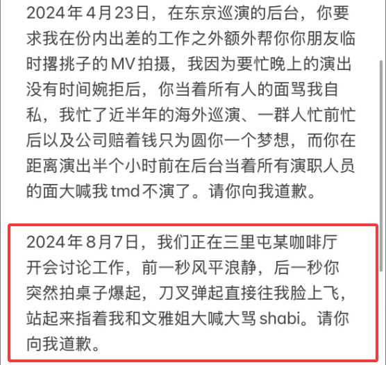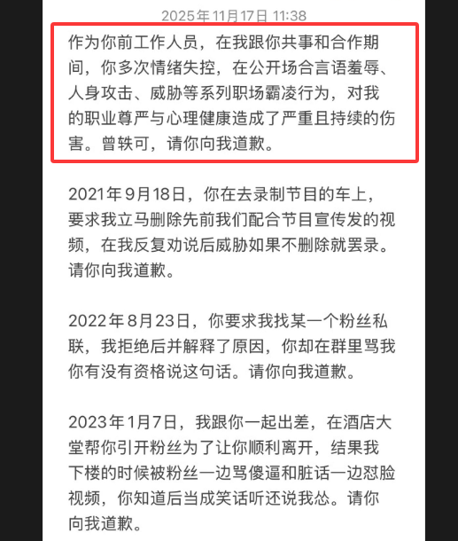 她的前工作人员发长文,怒斥她多次情绪失控,在公共场合言语羞辱、人身攻击、威胁自己,搞职场霸凌那一套,明明是曾轶可不配合工作人员的工作,她却反过来把工作人员一顿责骂;