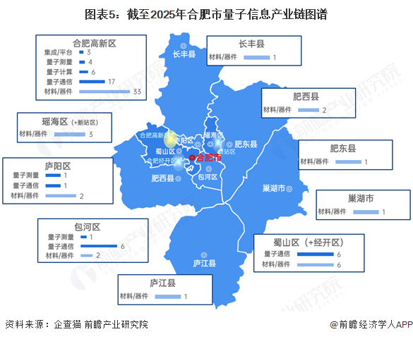 从区级企业数量分布来看,合肥市量子信息产业链企业高度集中在合肥市高新区(高新区聚集80%以上量子信息企业),蜀山区、经开区等其他区域依托科研资源或产业园区形成补充,多为配套或初创型企业。