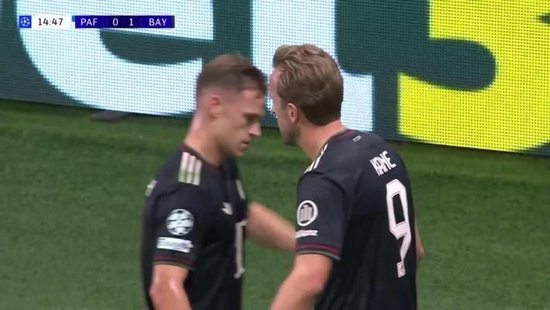 第15分钟,拜仁通过定位球策动攻势,奥利塞右路得球,突入禁区送出直塞,凯恩小角度不停球直接低射远角得手,拜仁1-0帕福斯。↓