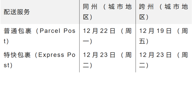 为避免失望,购物者需遵守以下截止日期,以确保包裹在圣诞前送达。