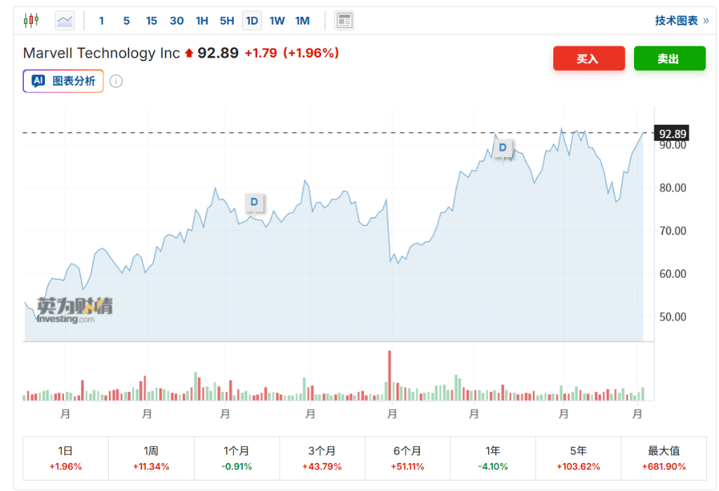 在人工智能热潮的推动下,迈威尔科技的股价在2024年飙升了83%,但今年以来已下跌16%,反映出在激烈竞争中,市场对其赢得长期订单的能力仍存在疑虑。