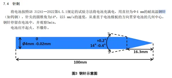 厂家必须保证自家的电芯用直径 4mm 的钨钢针刺穿后,依旧不起火、不爆炸,才有资格进入下一轮高温测试的环节。