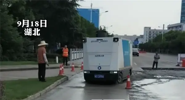 有无人快递车看到前方积水还勇往直前,最终成功把自己飘了起来。