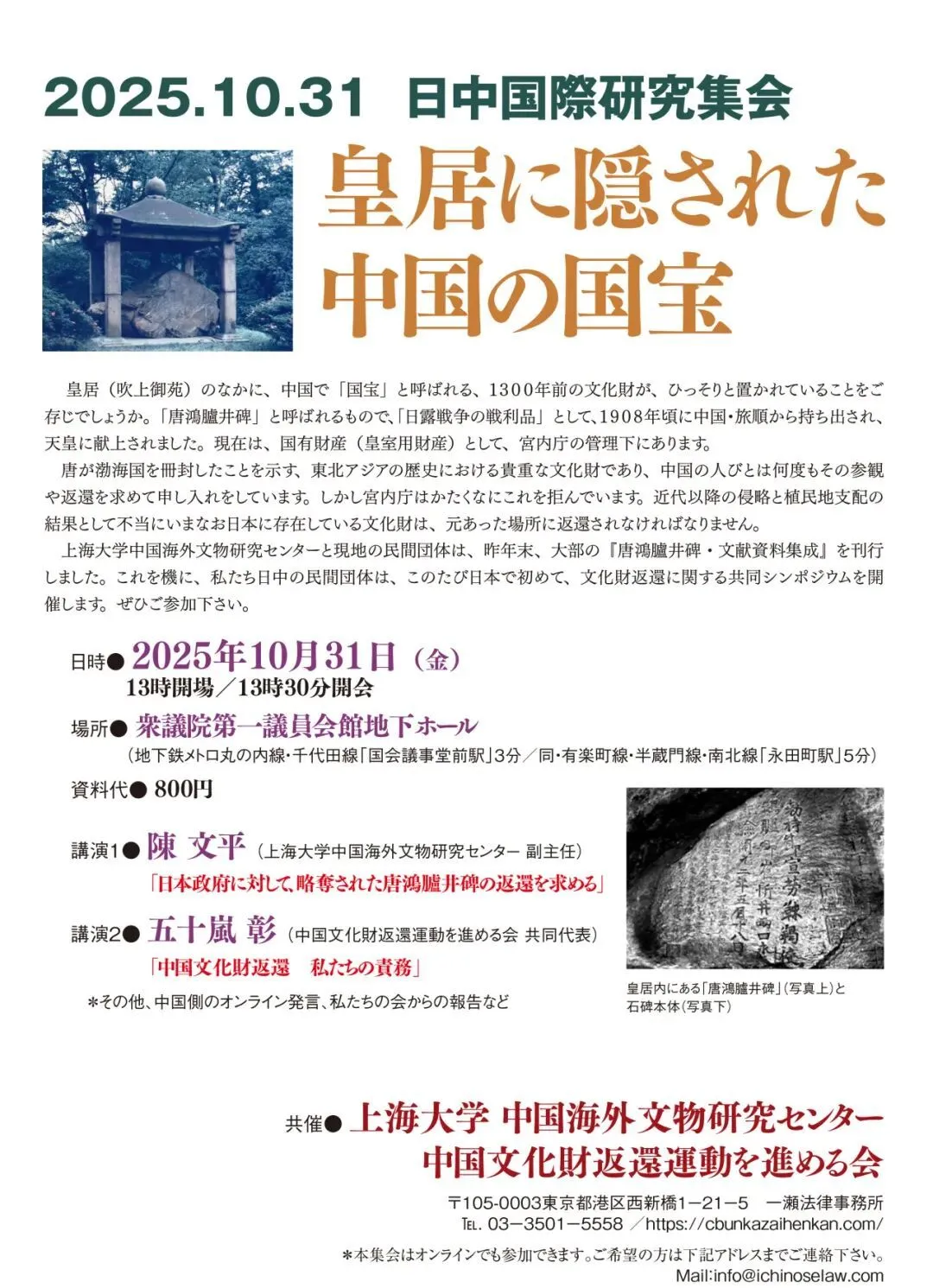 2025年10月,日本中国文物返还运动推进会在日本国会众议院会馆举办了研讨会,中方向日本国会议员提出申请,进入皇宫亲眼看唐鸿胪井碑,但至今没有下文。