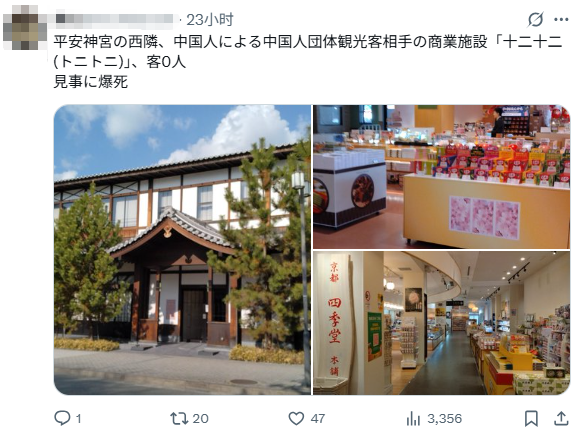 平安神宫西侧,由中国人经营、面向中国团体游客的商业设施“十二十二(Tonitoni)”,顾客为零。 彻底失败。