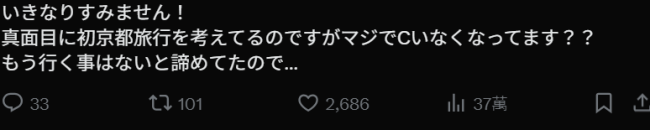 “突然打扰不好意思!我真的在认真考虑第一次去京都旅行,现在C(中国游客)真的不在了吗??我之前都已经放弃去京都了……”