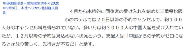根据毎日新聞报道,三重县松阪市一家今年四月起开始正式接待中国团体游客的酒店,在11月20日以后连日出现预约取消,总计超过一百名团客。