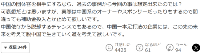 “如果是面对中国团体游客的话,按照过去的案例,这次的情况本来是可以预料到的吧?虽然觉得有些可怜,但实际上很多酒店或项目背后都是中国系的业主或赞助商,所以绝对不要动用补助金去救助。 这也是摆脱对中国依赖的机会,希望那些完全依赖中国的企业,能考虑未来的走向,思考脱离中国市场生存的方式。”