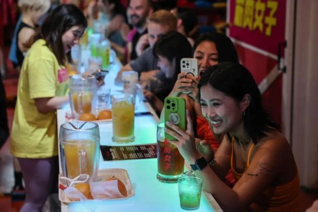 刷成粉色的墙壁,霓虹灯的迷幻光影,震耳欲聋的音乐,一位服务生给顾客调酒,轻轻松松徒手捏碎一只橙子或葡萄柚,周围的顾客都在为她欢呼,纷纷举起手机拍下这一幕。