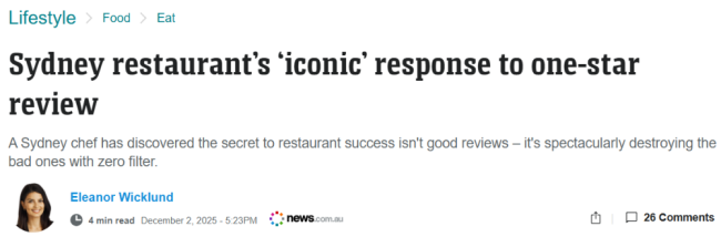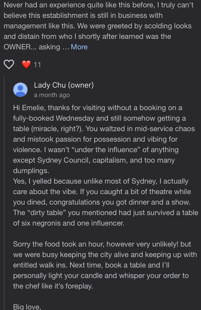 这家位于Potts Point的餐厅,因为老板Nahji Chu回复差评时毫不嘴软、火力全开的风格而在网络上爆红。