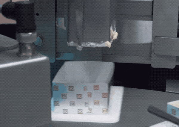 包黄油用的是铝箔复合纸,靠铝箔本身的材质去阻光、阻氧、防油、防水,延长黄油的保鲜期。虽然铝箔纸比较软,包黄油的操作依旧是先做出大概的包装壳,然后再装入黄油,继续包装。首先出场的是剪裁好的纸张。模具一个下压,就落地成盒。