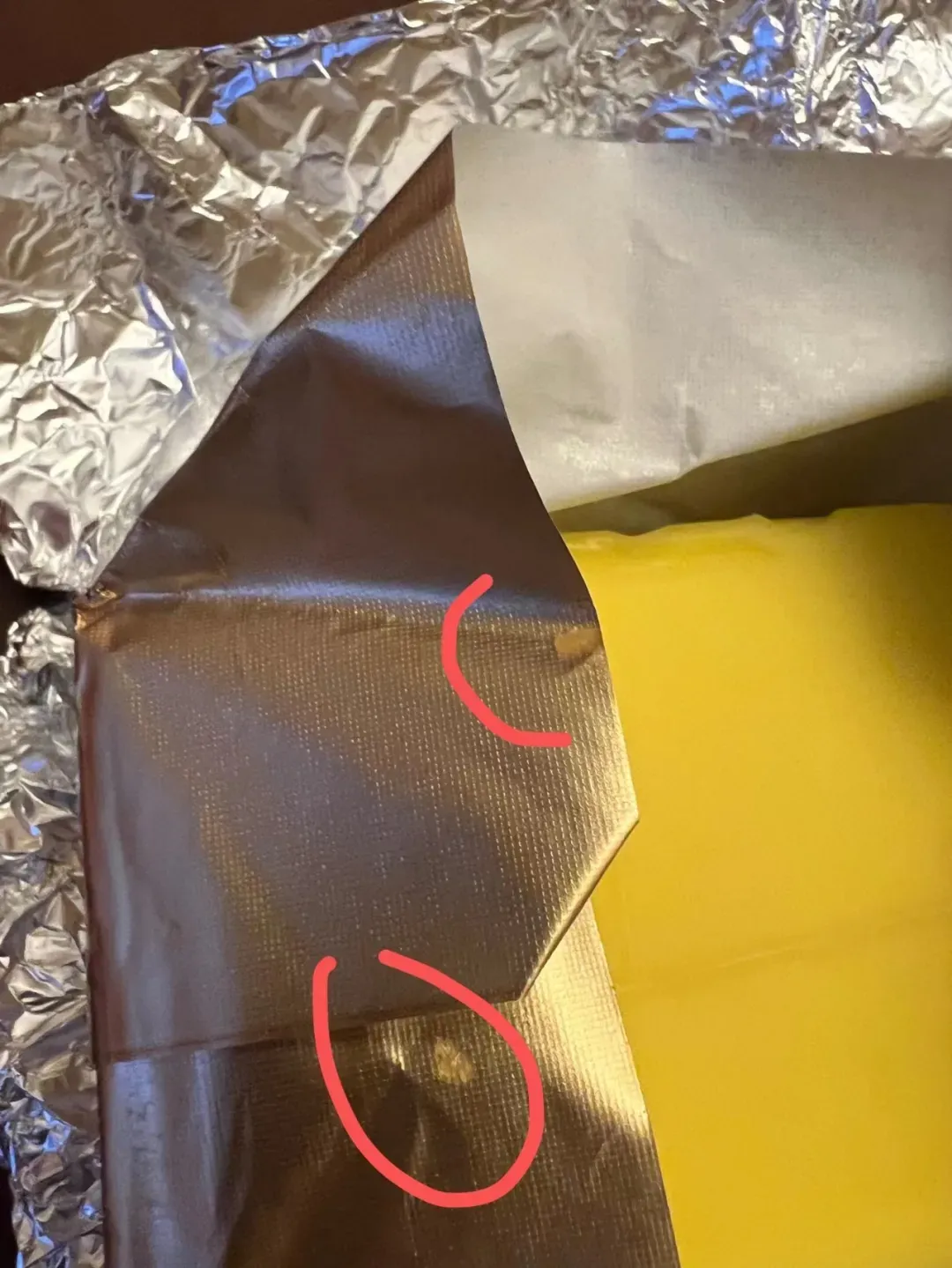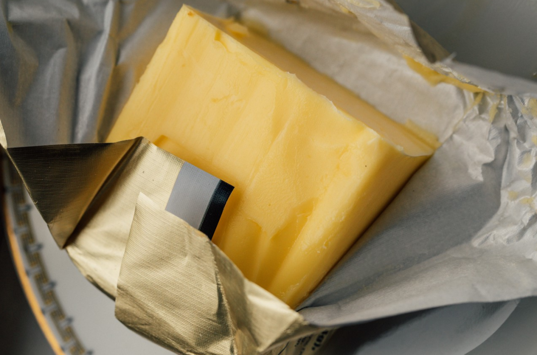 还有一个细节:包装黄油块的纸,在折叠面上还有点溢出来的黄油。如果是整块有些硬度的黄油被纸包装,应该不会出现这个不合群的小黄油点,这是黄油柔软时满溢的残留痕迹。