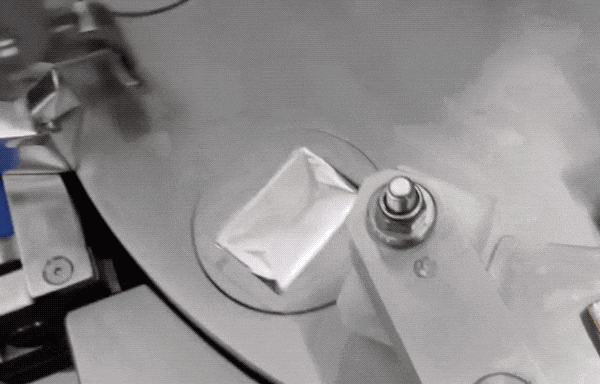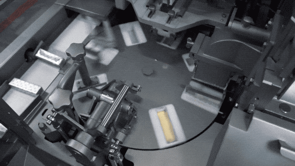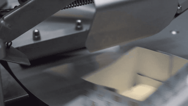 我们换另一款小长条的黄油,来看机器的整个操作流程。纸张下压形成盒子底部,然后灌入黄油,再折叠开口处,最后推出转盘,一个翻转,黄油块就成形了~收工!