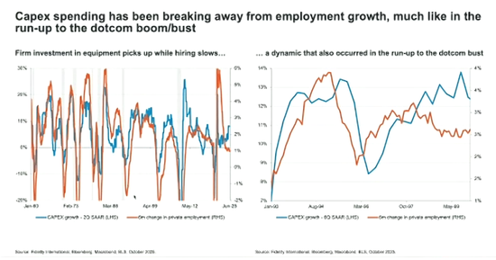 尽管部分AI公司估值偏贵,但富达国际认为AI带来的强劲业绩增长仍将持续,在基本面加持的情况下AI投资还是有不错的回报。更重要的是,AI资本支出增长的规模之大,带动了矿业、电力等能源需求大幅增长,还将带来广泛生产力的提升。