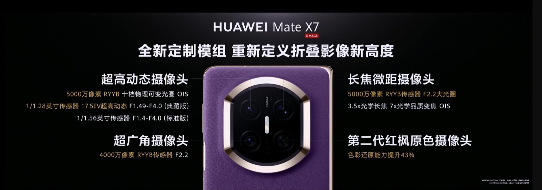 影像上,华为Mate X7系列配备5000万像素RYYB十档物理可变光圈主摄、4000万像素RYYB超广角(光圈是F2.2)、5000万像素RYYB长焦微距以及第二代红枫原色摄像头。