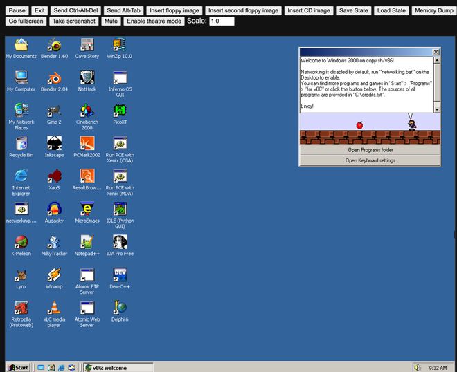 你也能体验到 Windows 2000,这个夹在 98 和 XP 之间、很多人压根没用过一两年的系统,桌面上还预装了一堆 Blender、Winamp 之类的老软件。