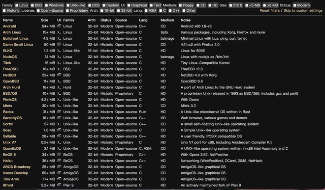 从 1985 年的 Windows 1.01 到 Windows 2000,从 Linux、FreeBSD 到 Android,再到 Haiku、KolibriOS、SerenityOS 这些你可能听都没听过的,100 多个操作系统排在页面上,像一部浓缩的计算机编年史,任你挑选体验。