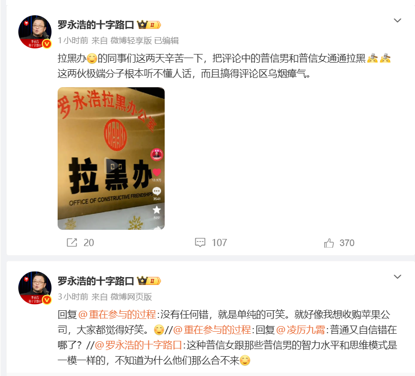 对此,罗永浩也没惯着粉丝,直接下场回复,并最新发文表态称:拉黑办的同事们这两天辛苦一下,把评论中的普信男和普信女通通拉黑这两伙极端分子根本听不懂人话,而且搞得评论区乌烟瘴气。