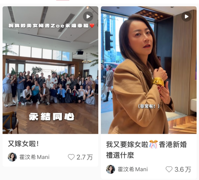 无论是艺人卫诗雅结婚,还是身边的秘书办喜事,她都发文“又嫁女了”。字里行间满是那种既欣慰又忍不住操心的老母亲式喜悦。