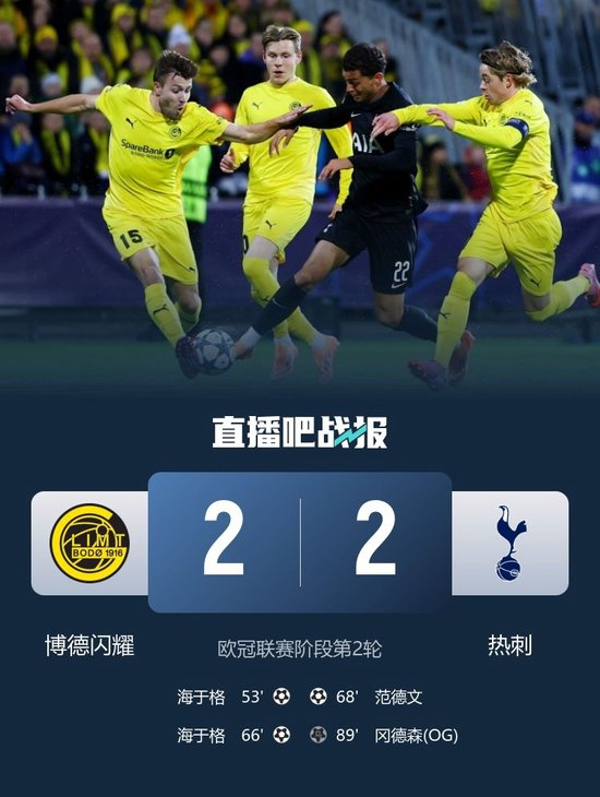 直播吧10月1日讯 欧冠联赛阶段第2轮,博德闪耀坐镇主场阿斯米拉体育场迎战热刺。上半场,霍格点球踢飞。易边再战,海于格个人秀双响,范德文破门,本坦库尔进球被吹,热刺造乌龙绝平。最终博德闪耀2-2热刺。积分榜方面,热刺2轮4分,博德闪耀2轮2分。