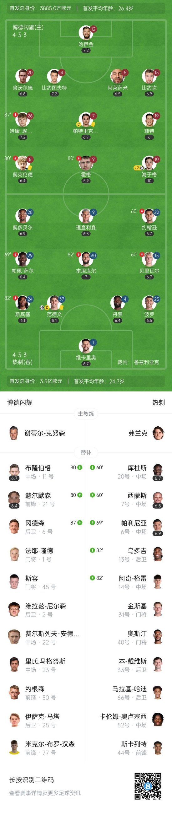 第53分钟,主队前场进攻,埃文森中路推进分球左侧,海于格得球内切晃过防守兜射远角入网,博德闪耀1-0领先↓