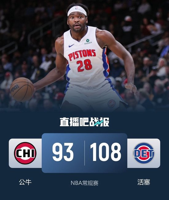 开场后公牛依靠布泽利斯的积极表现率先取得领先,不过随后活塞就回应攻势完成反超,活塞连续冲击内线在第一节结束时建立领先。第二节上来两队命中率都不高,外线投篮都是频频打铁,场上比分依旧十分胶着,活塞以2分微弱优势领先结束上半场。易边再战,公牛外线率先找打手感连中三分将比分反超,活塞这边迅速调整及时咬住比分。最后一节活塞上来连得7分完成反超,此后斯图尔特内线频频上演暴扣帮助活塞扩大优势,公牛进攻手感不佳,活塞将分差逐渐拉大到两位数,最终活塞108-93击败公牛取得3连胜,公牛遭遇3连败。