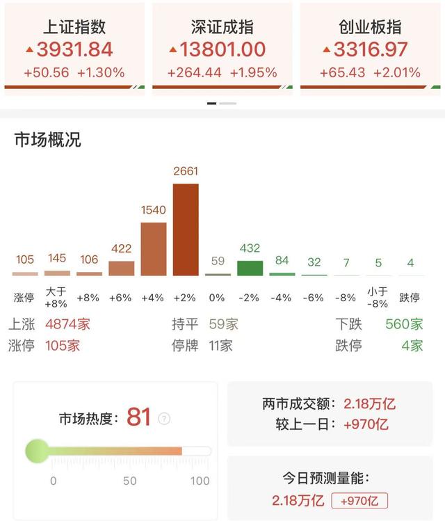 财联社3月25日讯,市场震荡反弹,沪指涨超1%重回3900点上方,创业板指涨超2%。沪深两市成交额2.18万亿,较上一个交易日放量970亿。盘面上,市场热点快速轮动,全市场超4800只个股上涨,其中105只个股涨停,连续2个交易日百股涨停。从板块来看,电力板块爆发,绿电概念领涨,十余只成分股涨停,华电辽能8连板,韶能股份6天5板,粤电力A走出6天4板。算力租赁概念走强,二六三、奥瑞德、利通电子、大位科技涨停。CPO概念表现活跃,铭普光磁、阿莱德、可川科技涨停。光纤概念震荡拉升,通鼎互联2连板,特发信息封涨停。下跌方面,油气股表现较弱,科力股份、通源石油下挫。截至收盘,沪指涨1.3%,深成指涨1.95%,创业板指涨2.01%
