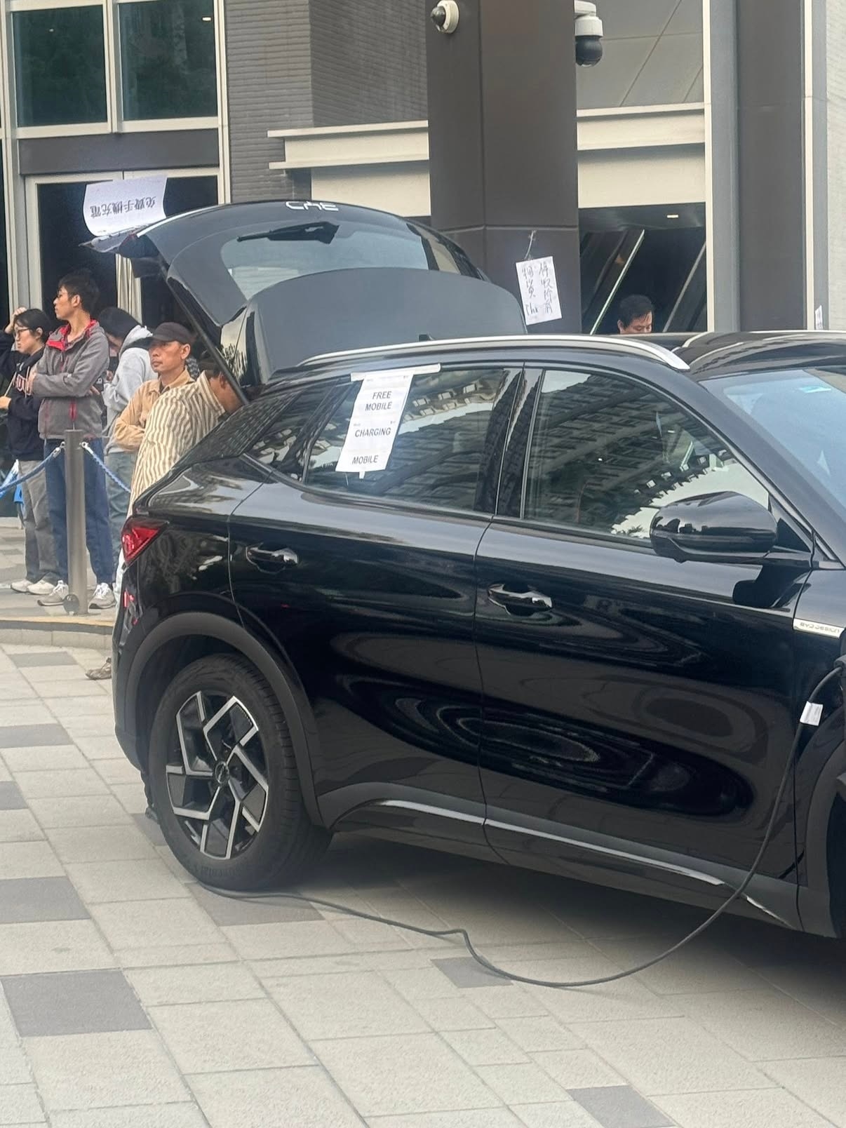 照片中,这辆比亚迪的后备箱打开,旁边张贴有“免费提供电力”的纸张。同时,有多个手机正在插座上充电,比亚迪车辆也成了一个大号充电宝。