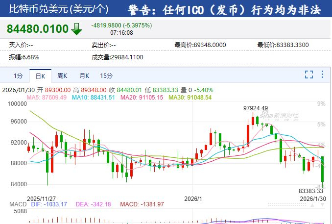 1月29日,比特币价格跌破85000万美元关口,盘中一度大跌6.8%,一度触及83383.33美元。截至发稿,报84480美元,跌幅5.39%。