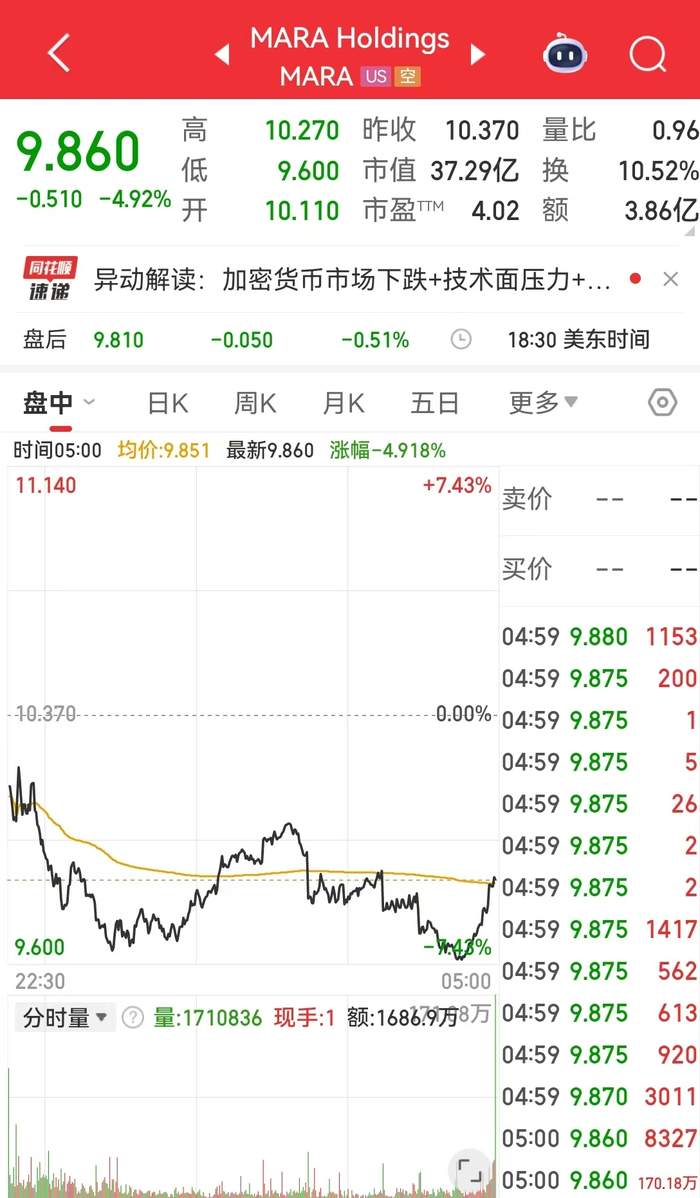 比特币下跌也拖累了相关加密概念股表现。数字交易平台Coinbase Global(COIN.US)、矿企MARA Holdings(MARA.US)股价下挫近5%。