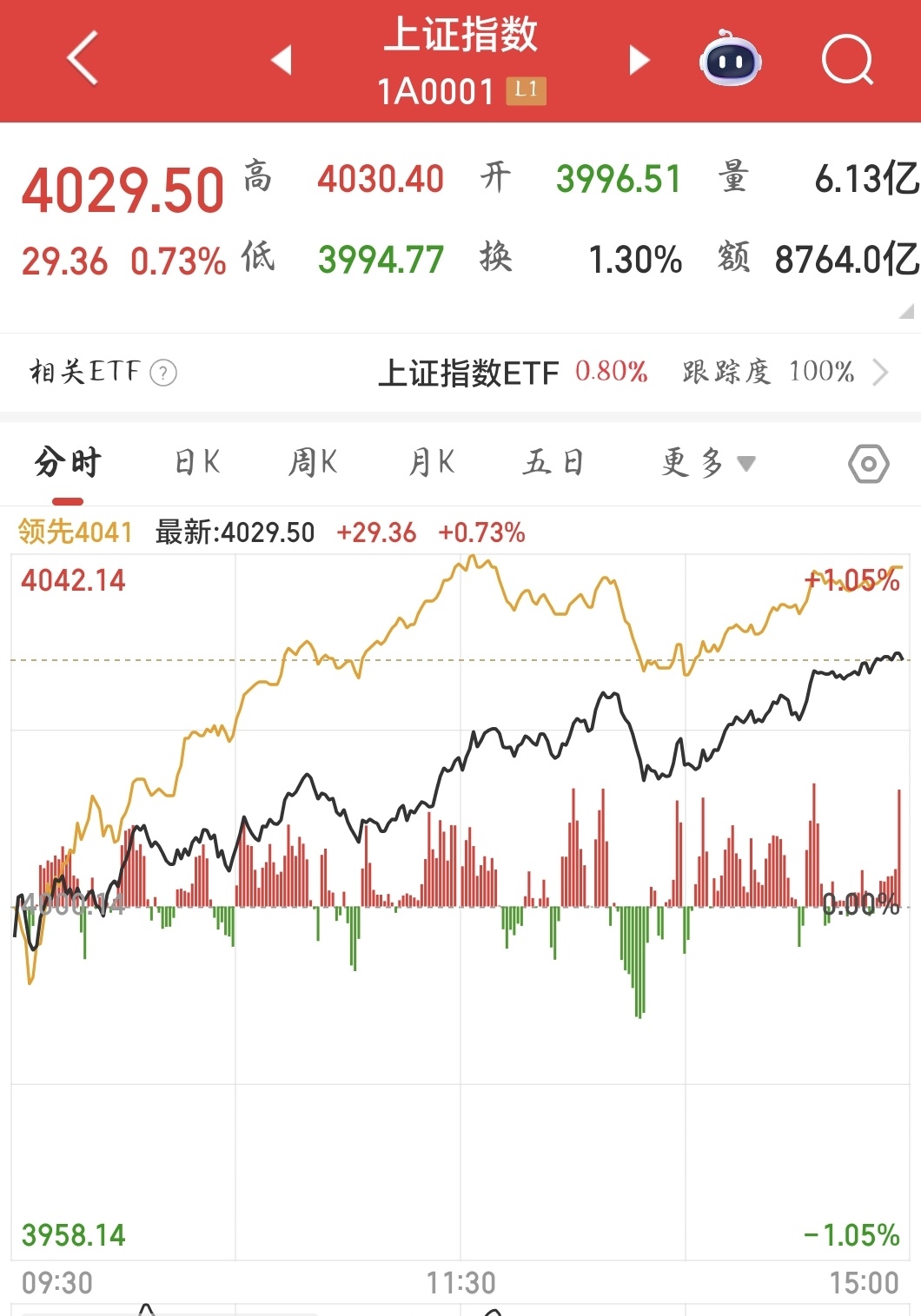 11月13日,A股全天震荡攀升,截至收盘,沪指上涨0.73%突破关键阻力位,正式刷新近十年收盘高点,实现“4000点加油站”震荡后的重要突破,深成指、创业板指分别大涨1.78%、2.55%,其中创业板指终结多日调整态势,与科创板形成同步企稳信号;全市场交投活跃度显著提升,成交额达20657亿元,较前一日增量1009亿元,近4000只个股飘红,涨停家数超百家,市场情绪从谨慎转向积极。