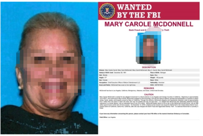 美国联邦调查局(FBI)正在通缉74岁的玛丽‧卡罗尔‧麦克唐纳(Mary Carole McDonnell),她涉嫌冒充美国航空航天先驱企业家族的继承人,在加州诈骗近3,000万美元。根据FBI的通缉令,麦克唐纳1951年出生于密歇根州。行骗作案地点主要在加州洛杉矶县和橙县。她谎称自己是麦克唐纳飞行器公司(McDonnell Aircraft,美国航空航天制造公司和国防承包商)家族的继承人,并声称自己有权支配一笔价值8,000万美元的秘密信托基金。
