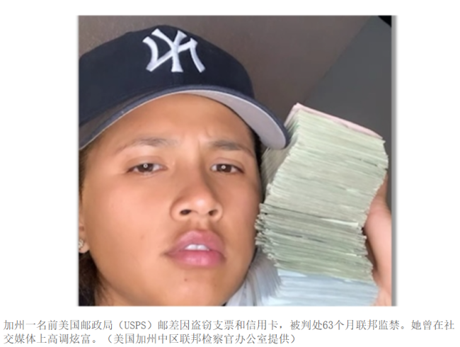 加州一名前美国邮政局(USPS)邮递员因盗窃信件中的支票、借记卡和信用卡等,并在三年间多次作案,被判处63个月联邦监禁。美国司法部周一(12月8日)表示,现年31岁的加州卡森市(Carson)居民玛丽·安·马格达米特(Mary Ann Magdamit)于8月承认一项共谋银行诈欺罪。周一,联邦法官沃尔特(John F. Walter)作出最终裁决,除了63个月的刑罚外,法官还命令她支付超过66万美元的赔偿金。
