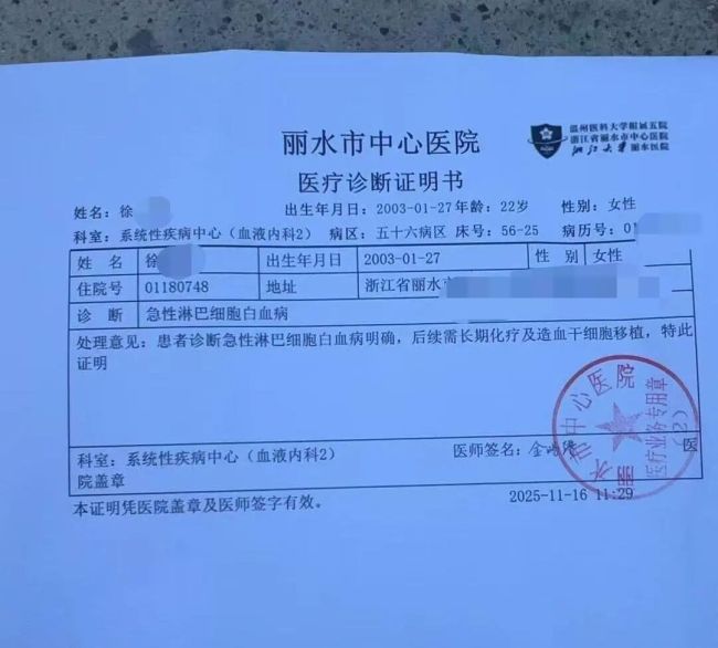 如今,徐某仍在丽水中心医院住院治疗,每天都要输液,反复发烧、咳嗽、头晕、想吐、吃不下饭、浑身无力成为她的日常状态。“还在等杭州的基因报告,要看是不是基因突变才能制定化疗方案。”徐某说,化疗时长因人而异,且需要等身体各项指标稳定后才能开始,目前多项指标仍存在异常。更让她担忧的是骨髓移植——不仅要寻找合适的配型,高昂的费用也让这个贫困家庭望而却步。