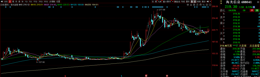海光信息复牌当日股价也出现大幅高开,随后也在第三季度股价出现大涨,期间最高价277.98元/股相较于停牌前股价同样也已翻倍。截至今日收盘,该股报收219.30元/股,总市值达5097亿元。