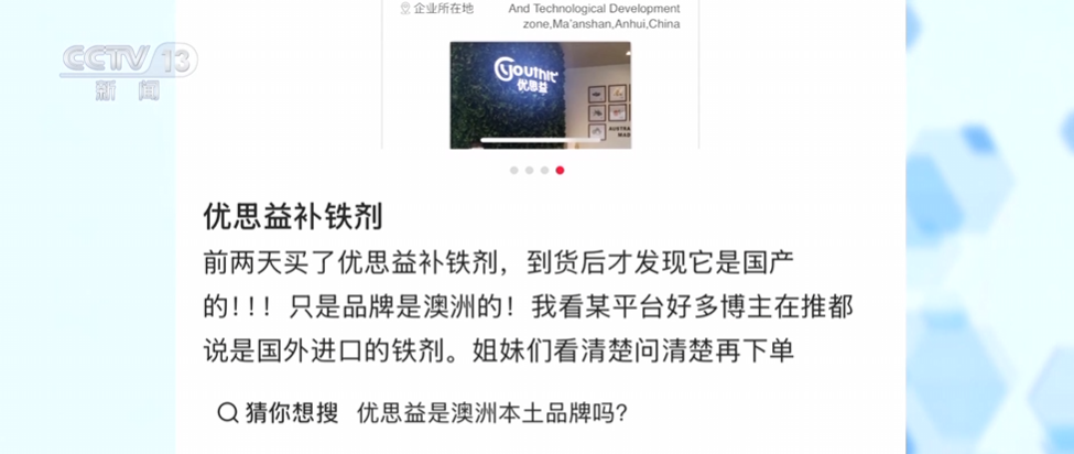 不过,有消费者在社交平台爆料,其购买的优思益补铁剂到货后发现为国产产品,并晒出进口商品溯源信息截图,相关企业名称翻译为仙乐健康科技(安徽)有限公司。