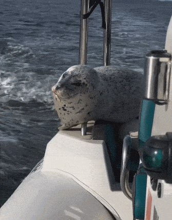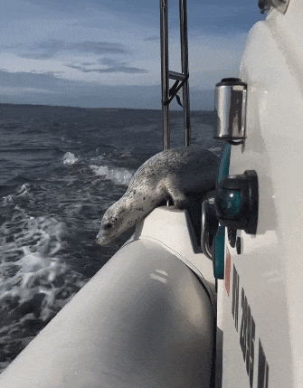 海豹回头瞄了夏维特一眼,立即钻到水里,然后居然从船尾爬上了船,站在了发动机旁的平台上——它把这当救生筏了。