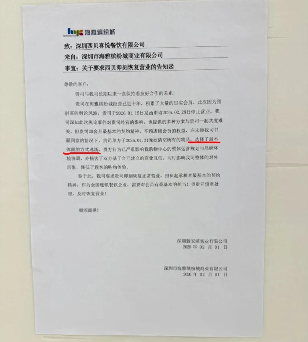 然而西贝在未获商场书面同意的情况下,于1月31日晚欲清空店内物品,被指采取最不体面的方式逃场,因此要求西贝立即恢复营业。