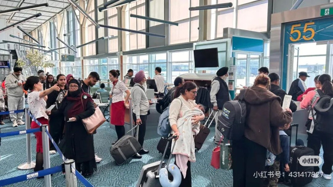 与此形成鲜明对比的是,排队队伍中不少中国及其他国家的年长旅客,始终安静守序地等待广播通知。