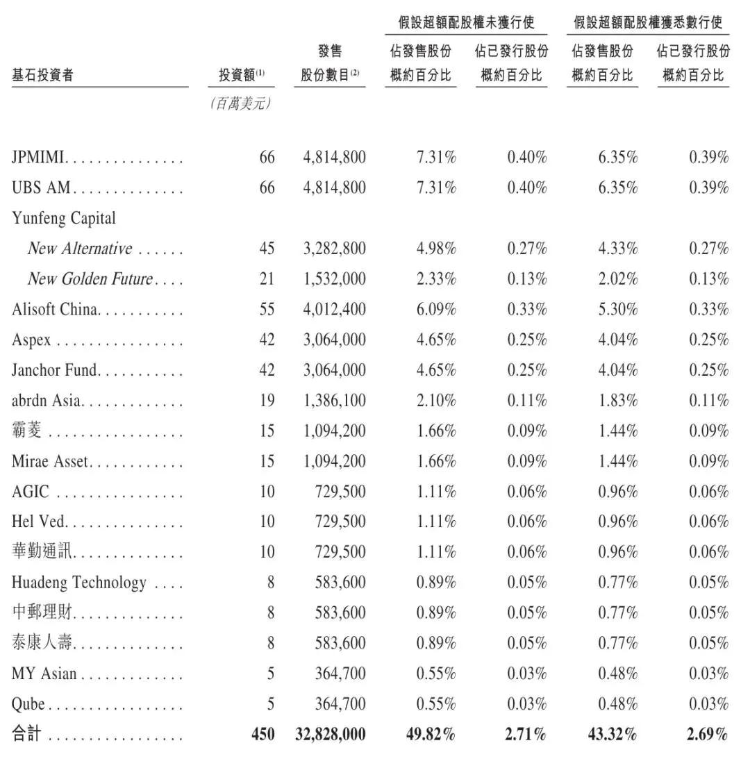 阿里旗下Alisoft China认购5500万美元,Li Ho Kei通过Aspex、Janchor Fund分别认购4200万美元,abrdn Asia认购1900万美元,霸菱、Mirae Asset分别认购1500万美元,AGIC、柴允敏旗下Hel Ved、华勤通讯分别认购1000万美元,Huadeng Technology、中邮理财、泰康人寿分别认购800万美元,MY Asian、Qube分别认购500万美元。