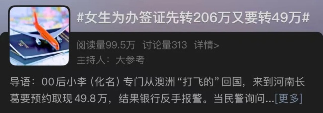 同样是在澳留学的中国留学生小李(化名),前段时间也是特别从澳洲“打飞的”回国,来到河南长葛上来就预约要取现多达49.8万,也是被银行反手直接报警!