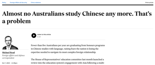 过去20年来中文荣誉课程下降非常明显,未来可能面临被取消的风险,这意味着澳大利亚正在失去理解其最复杂外交关系所需的专业能力。