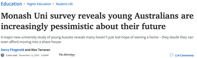 莫纳什大学最新发布的《2025年澳洲青年晴雨表》描绘出一幅令人担忧的现实图景: